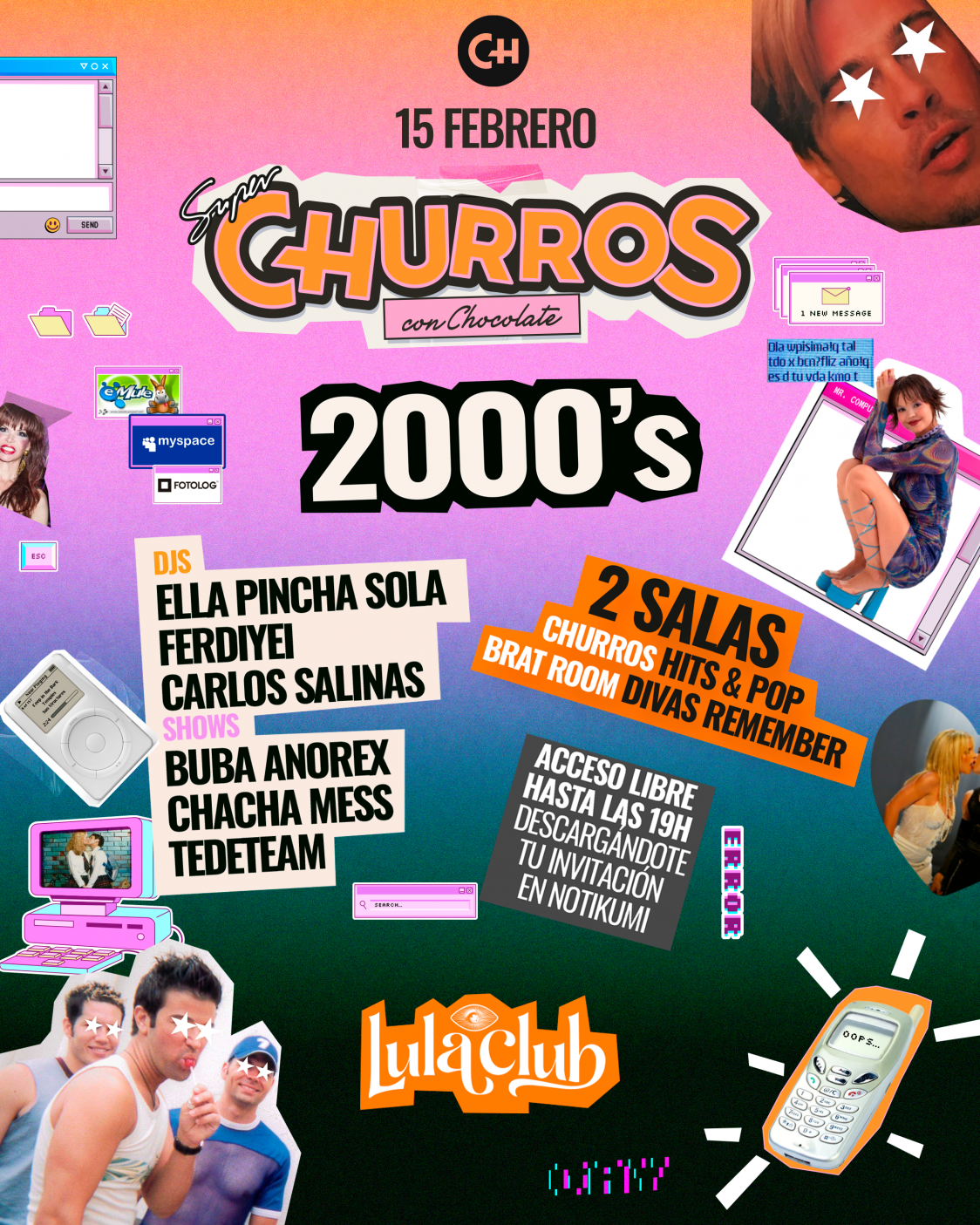 💿 El 15 de febrero CHURROS 2000’s en Lula Club 📹 Creímos que los PC’s explotarían pero lo único que lo hizo fueron las divas del pop y los pantalones de campana, ¡vuelven los 2000’s! 🎮 Prepara lookazo porque, oops… we danced again! 🔥