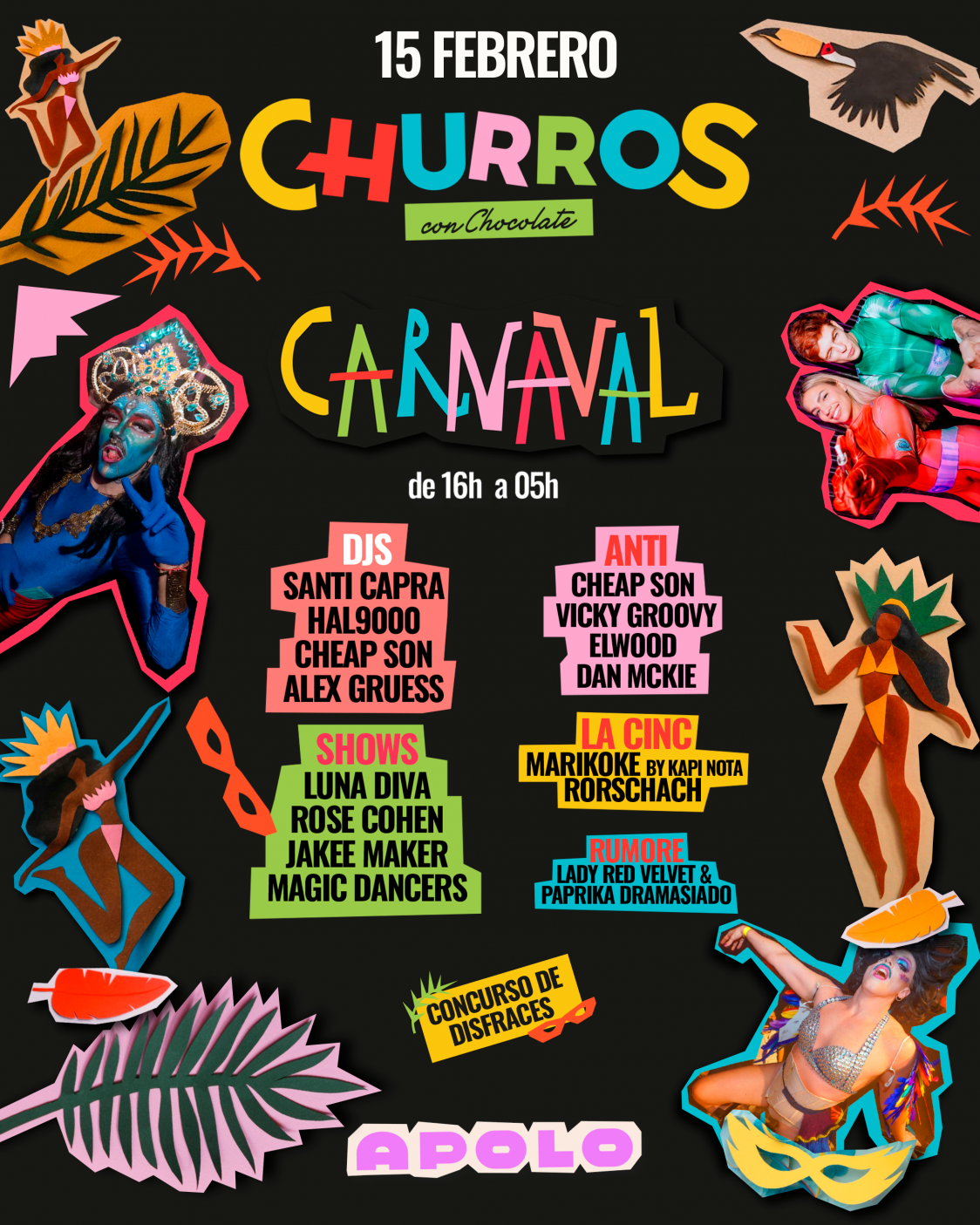 ✨ El 15 de febrero llega una de las fiestas más esperadas de la temporada: CARNAVAL 🦚 Cúrrate tu disfraz porque, ¡se viene concursazo en Sala Apolo! ✨ Súper premios al mejor disfraz grupal y por pareja/individual 💸 Apúntate en la Rumore de 17h a 19h ⚡️🕺 Baila de 16h a 05h 🕓 ¡4 salas abiertas!