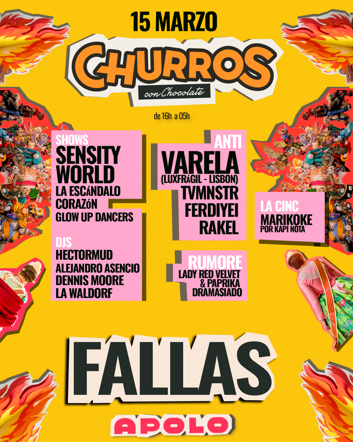 🧨El 15 de marzo CHURROS FALLAS con Sensity World en Sala Apolo 💥 Te hemos preparado una buena mascletà al estilo churrero, ¡la terreta bien de glitter! ✨ ¡Y en ANTI tendremos a Varela (LuxFrágil – Lisboa) dándonos traca de la gorda nano! 🔥