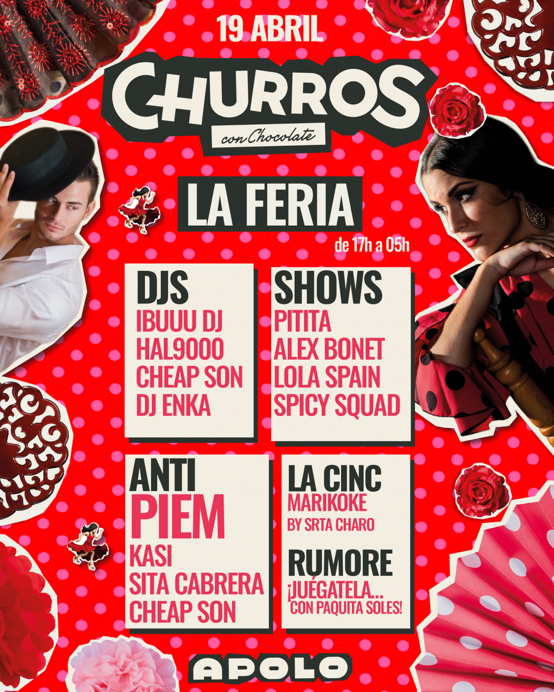 💃🏻El 19 de abril CHURROS LA FERIA en  Sala Apolo 😉 Prepara la peineta y tu traje de flamenca que abrimos la caseta más glitter y petarda ✨ Y en ANTI tendremos Piem haciendo las delicias de los más clubbers 😎