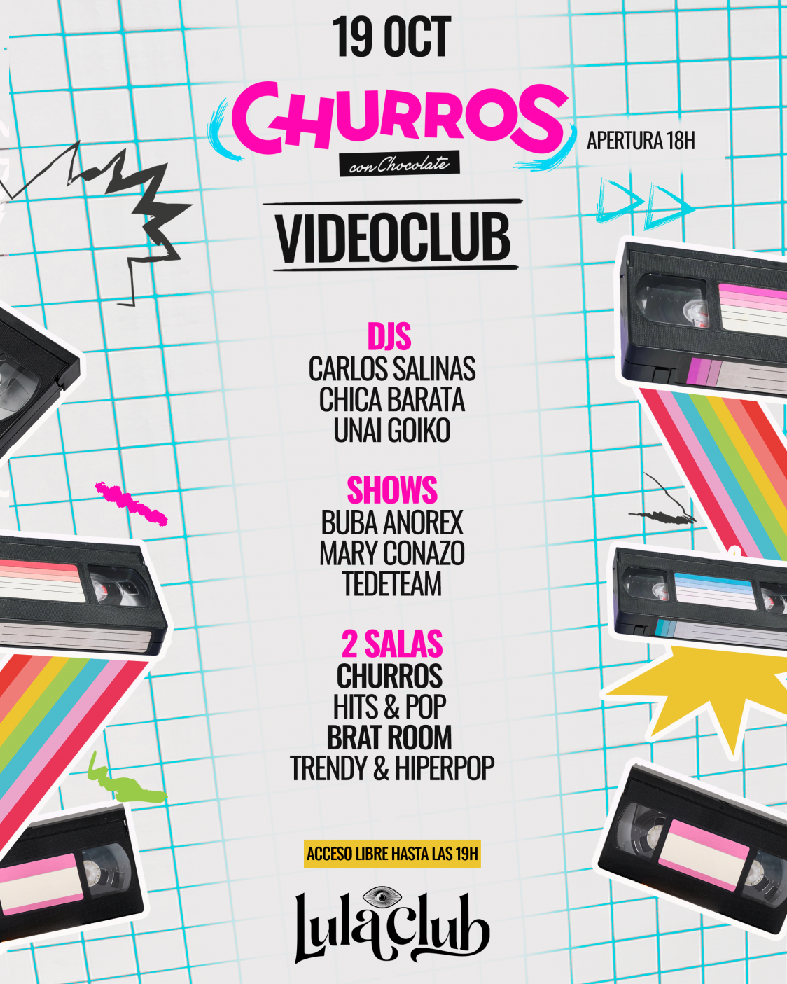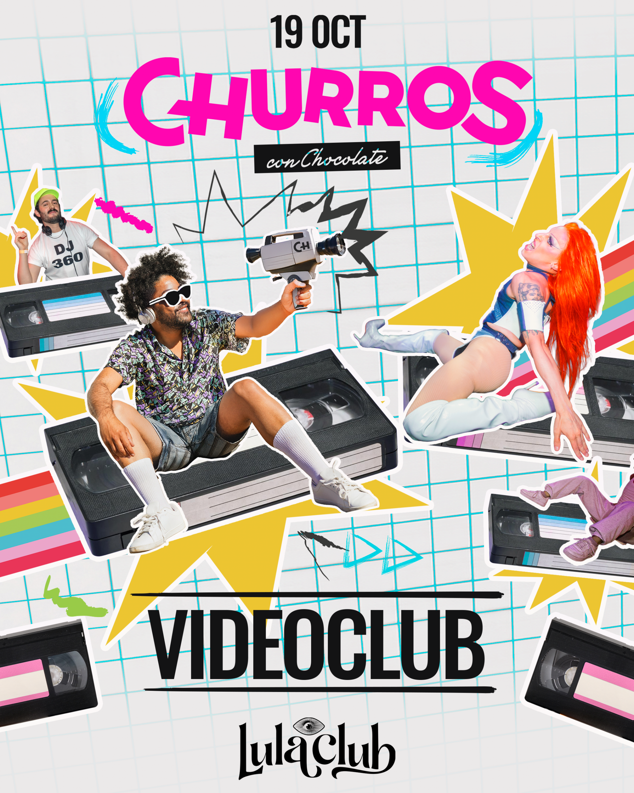 📼 El 19 de octubre CHURROS VIDEOCLUB en Lula Club 🕹️ Rebobina, dale al play y déjate llevar a los 80´s y 90´s ✨ Colores neón, iconos pop y temazos actuales inundarán la Gran Vía de Madrid 🕺¡2 salas abiertas! 🎉
